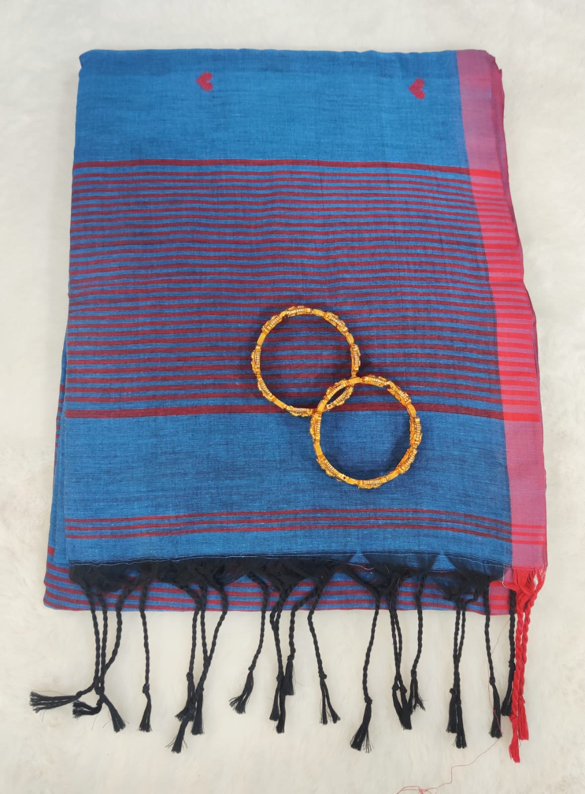 Crafted in soft and breathable linen fabric, this saree offers a lightweight feel, comfortable drape, and natural texture that makes it ideal for long wear. The fine striped detailing across the pallu and border adds visual depth, while the minimal woven heart motifs on the body lend a playful yet elegant handcrafted appeal.
