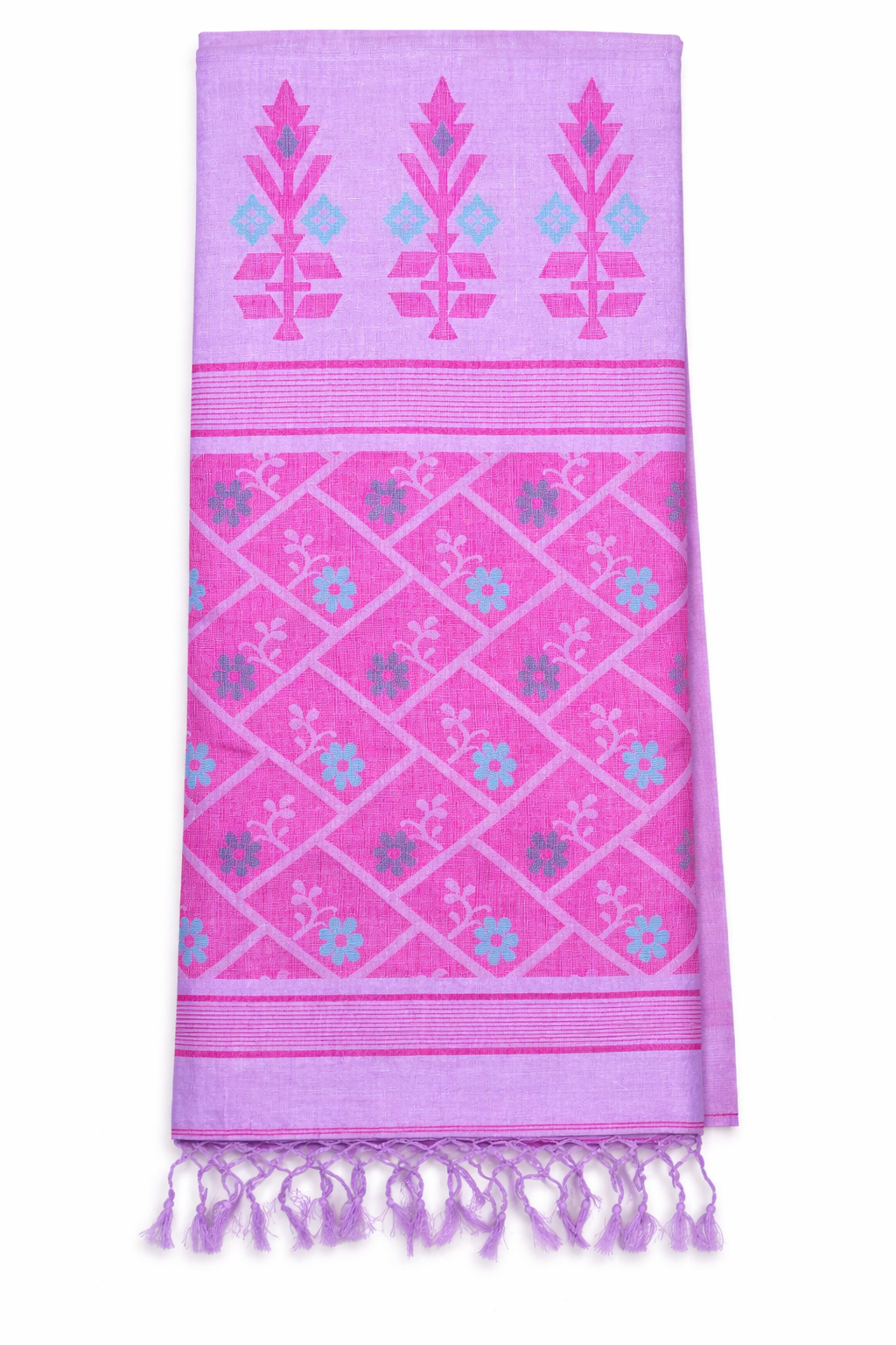 This candy pink Matka silk Jamdani saree is a charming ethnic drape crafted with a bright festive tone and elegant woven artistry. The saree showcases a geometric floral lattice pallu design that adds texture and traditional character, making it a beautiful pick for festive wear, puja, family functions, day celebrations, and elegant gifting.