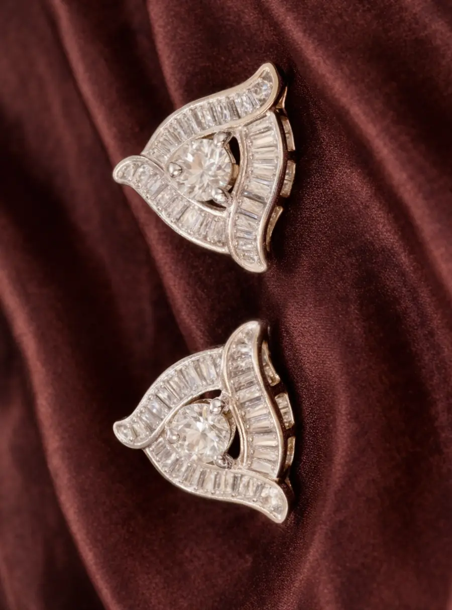 The Celestial Curve Diamond Statement Studs feature a graceful layered silhouette, where flowing arcs of baguette-cut stones frame a radiant round centerpiece. The architectural curves create depth and movement, while the central stone draws the eye with luminous sparkle.