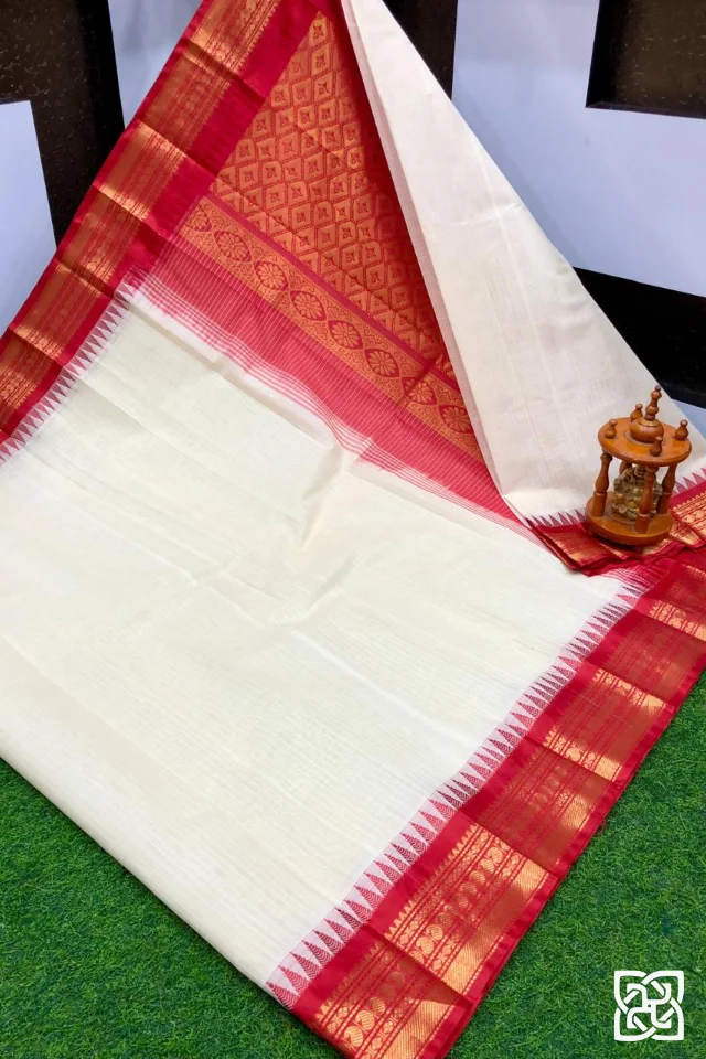 Cream White with Red Jacquard Border – Pure Handloom Cico Gadwal Saree