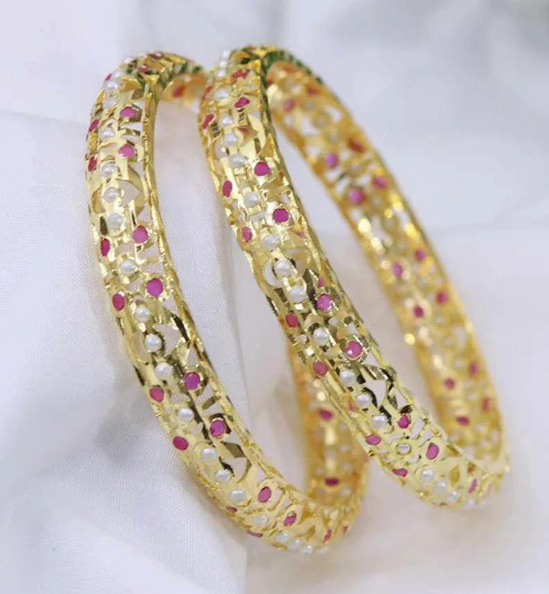 Each piece showcases a harmonious floral lattice design, enriched with vibrant stone embellishments that add a graceful pop of color while maintaining a regal gold-toned base. The detailed craftsmanship reflects heritage aesthetics, making these bangles perfect for weddings, festive occasions, and cultural celebrations.