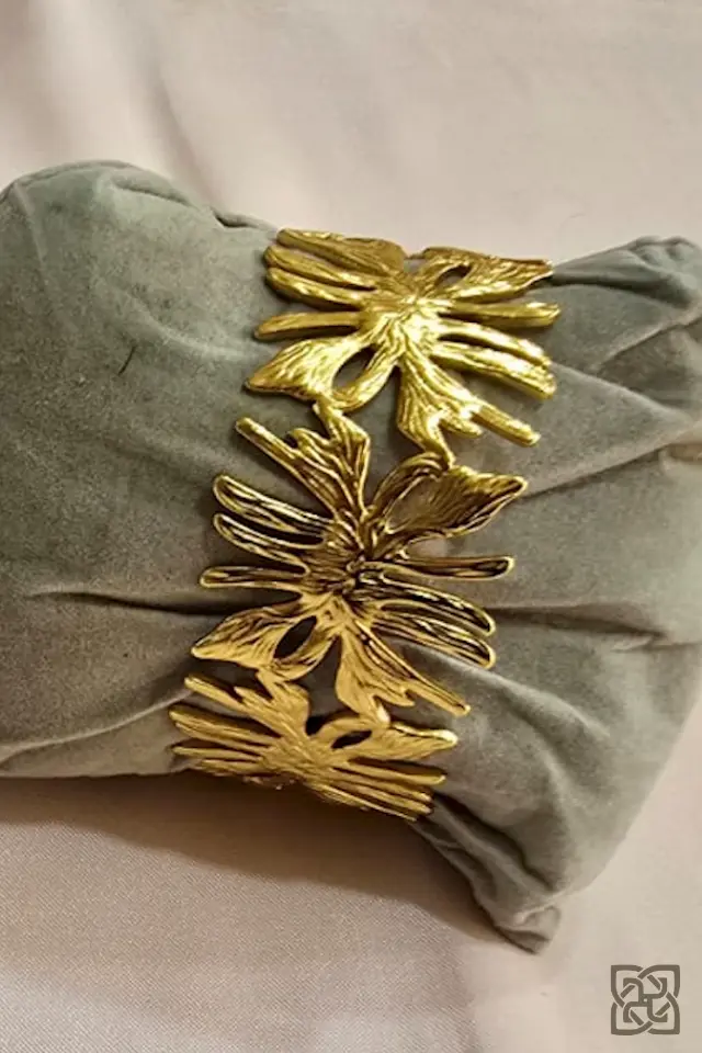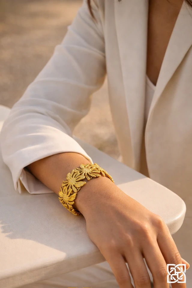 Make a striking impression with this beautifully crafted gold floral cuff bracelet. The wide cuff silhouette creates a bold, eye-catching statement while remaining graceful on the wrist. This versatile bracelet elevates both casual and dressy outfits — wear it alone as a standout piece or pair it with complementary gold accessories for layered glamour.