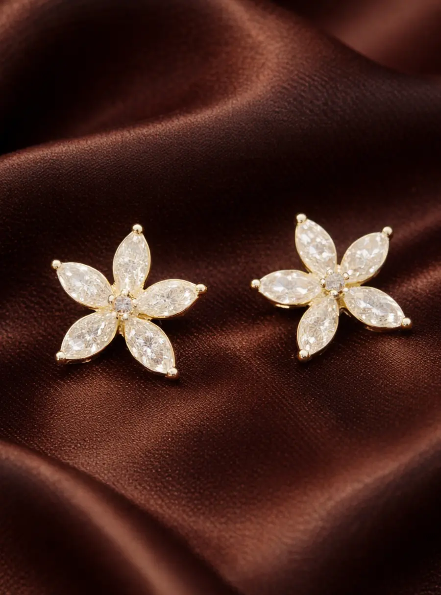 The Eternal Blossom Diamond Stud Earrings feature a refined five-petal floral silhouette, delicately crafted with marquise-cut stones that radiate outward from a brilliant center. The elongated petals create graceful symmetry, giving the design both softness and striking brilliance.