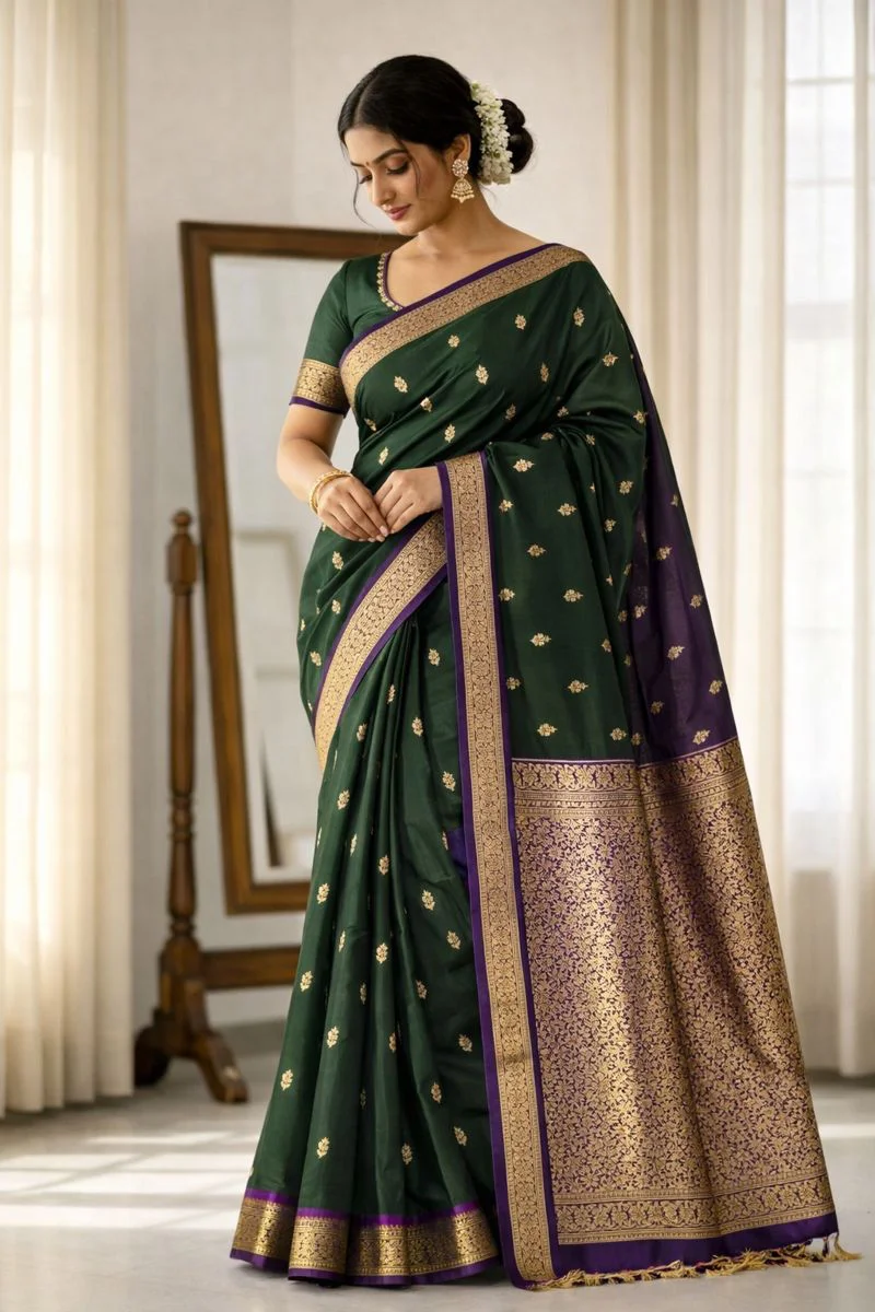 Forest Green & Lavender Gold Pure Kanchi Pattu Small Border with Laksha Buta Saree