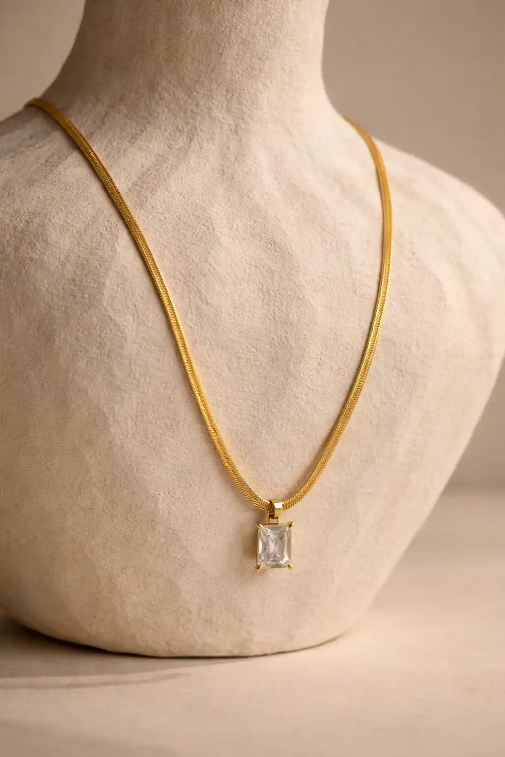 Timeless and refined, this gold-finish pendant necklace is designed to make a graceful statement. Featuring a stunning emerald-cut crystal pendant, the clean geometric silhouette reflects light beautifully, adding a touch of brilliance without overpowering the look.