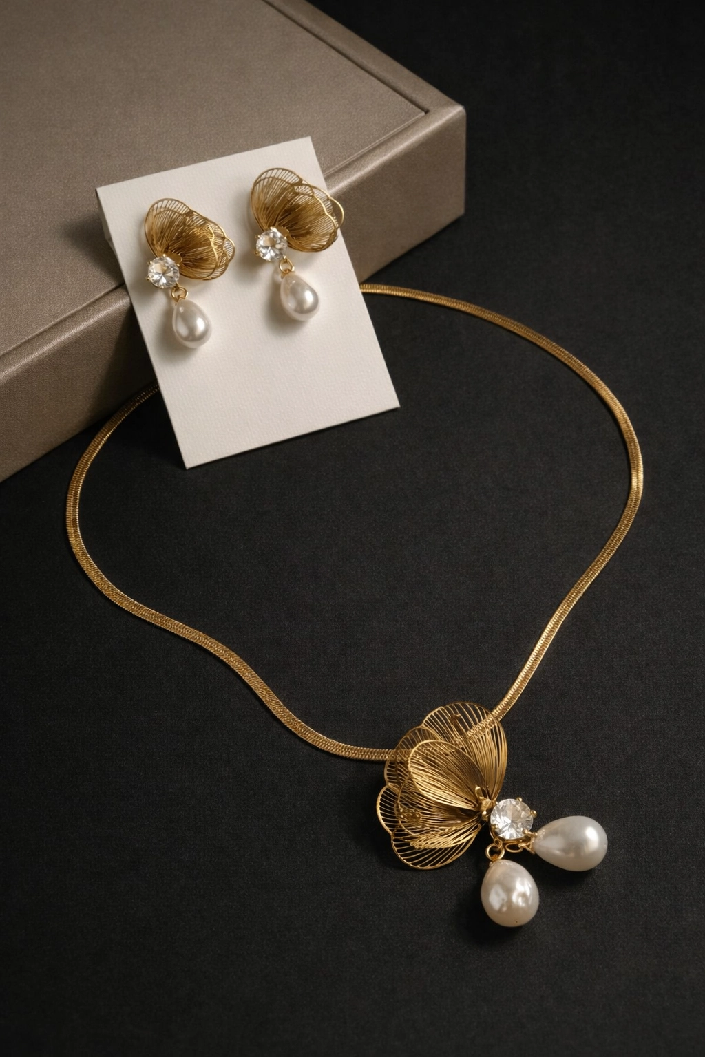 Elegant and feminine, this gold-finish necklace and earring set is crafted to make a refined statement. Featuring a delicately sculpted wire-frame floral motif, the design is elevated with a sparkling crystal accent and finished with graceful pearl drops that add movement and softness.