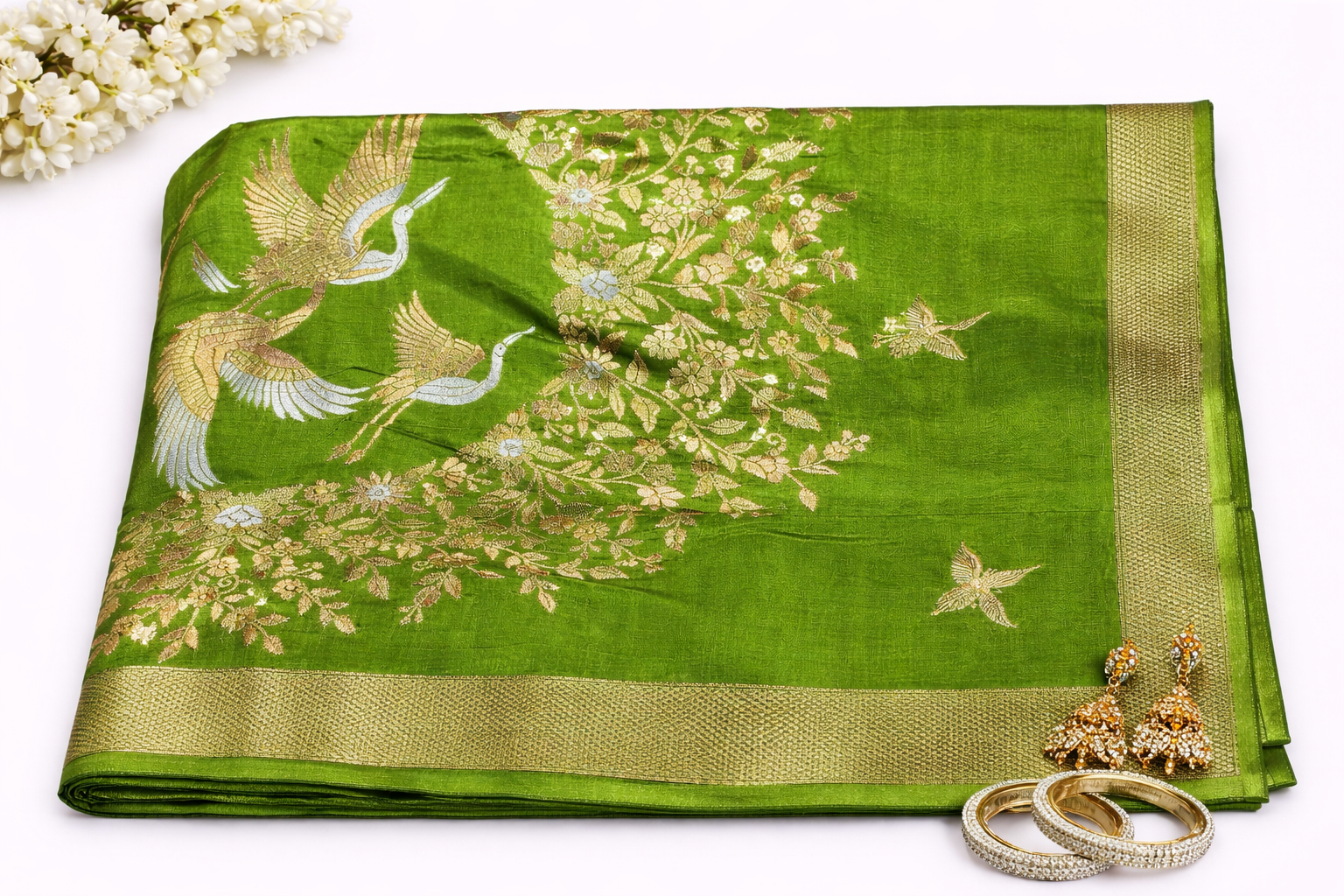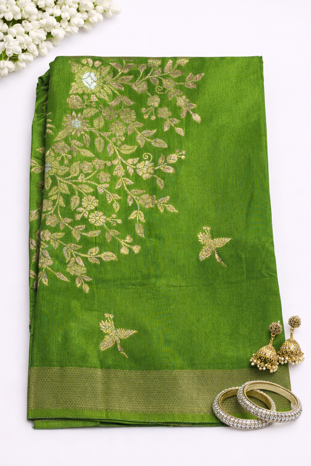 Green Russian Silk Saree with Floral Bird Weave & Rich Zari Border