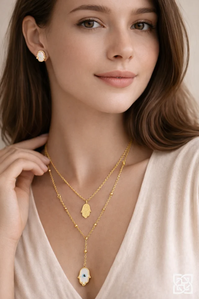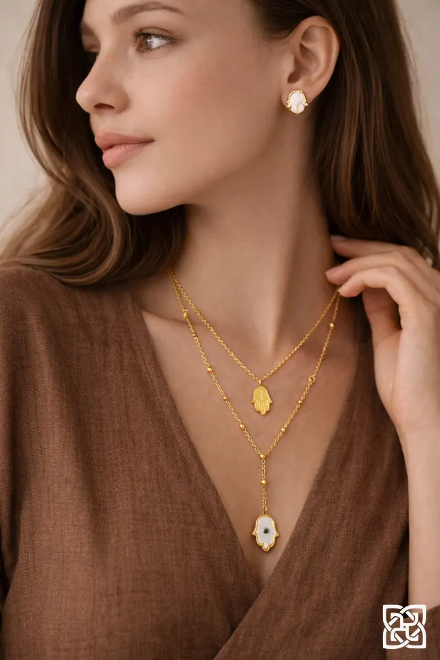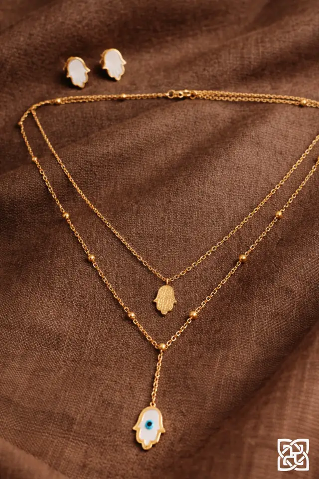 Elegant and symbolic, this Hamsa evil eye layered gold necklace set blends timeless protection motifs with contemporary design. Featuring delicately layered chains adorned with a sculpted Hamsa charm and a luminous evil eye accent, the design creates depth, movement, and meaning. Finished with subtle gold bead detailing, this versatile piece offers effortless elegance while carrying a powerful symbol of positivity and protection—perfect for everyday styling or meaningful gifting.