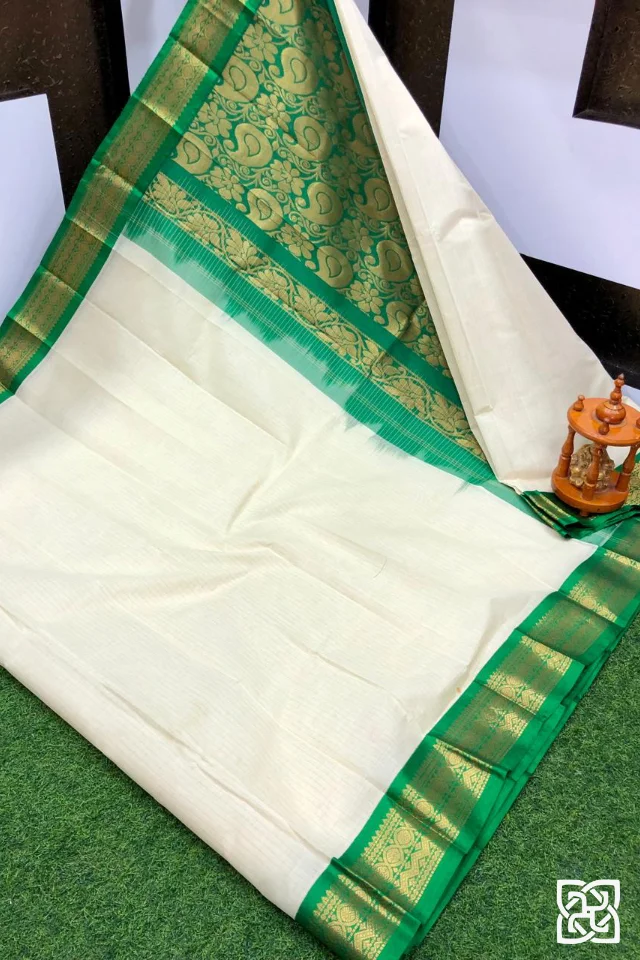 Ivory White with Emerald Green Jacquard Border – Pure Handloom Cico Gadwal Saree