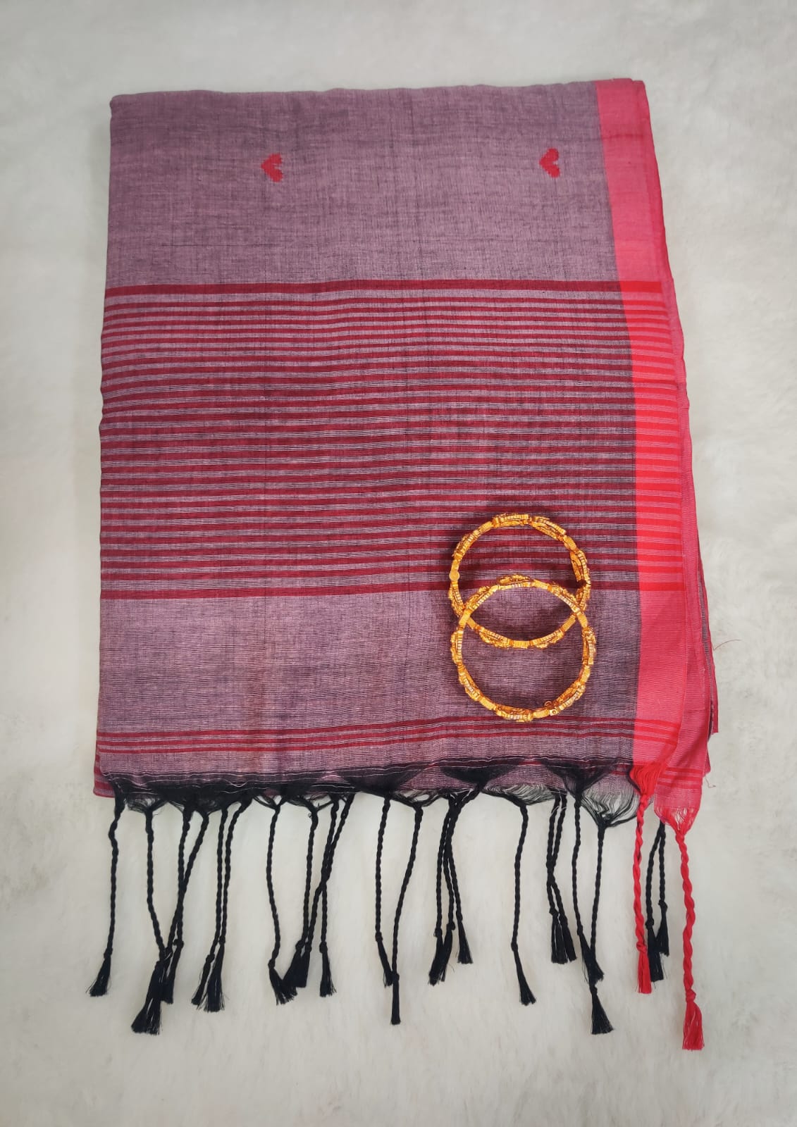 Crafted from soft and breathable linen fabric, this saree offers a lightweight feel, natural texture, and a comfortable drape ideal for all-day wear. The subtle striped detailing across the pallu and border adds depth and elegance, while the small woven heart-inspired motifs on the body bring a delicate handcrafted touch.