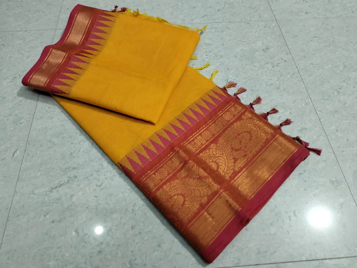 Mustard Yellow Kanchi Cotton Saree with Maroon Zari Border