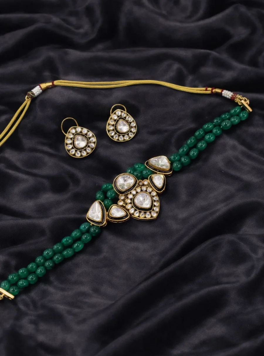 The Noorika Emerald Polki Beaded Choker Set features twin strands of rich emerald-green beads, creating a striking base that beautifully complements the ornate central polki-inspired motif. The pendant showcases layered teardrop and circular elements adorned with luminous uncut-style stones, framed in a classic gold finish for a timeless royal appeal.