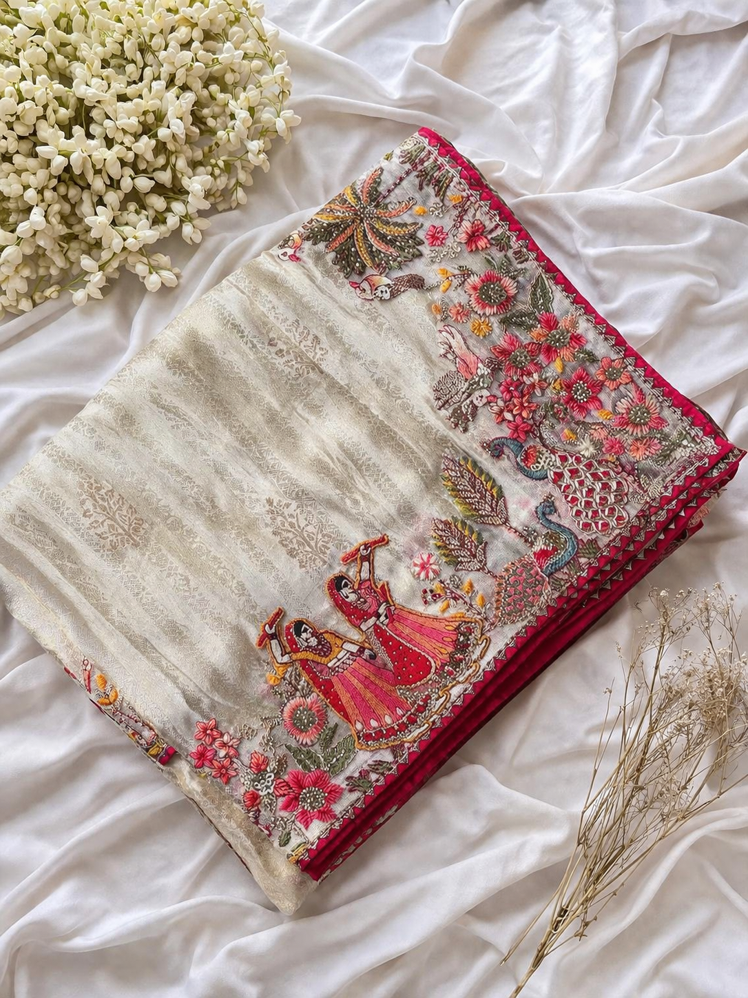 Shop this luxurious off white designer organza saree featuring heavy multicolor floral embroidery, peacock motifs, embellished border work, and a stunning rani pink designer blouse. Perfect for weddings, receptions, festive occasions, and bridal trousseau collections.