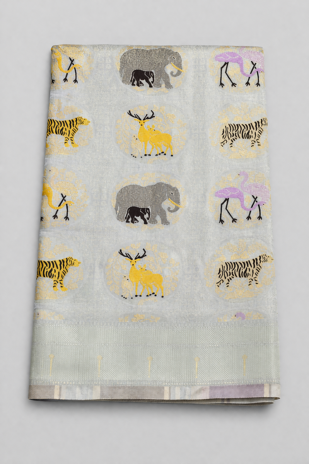 Bold prints, nature-inspired beauty, and effortless elegance our Jungle Theme saree is made to turn heads. off white semi Gadwal saree is designed with a serene, elegant look featuring subtle woven motifs and refined traditional detailing. Lightweight and graceful, it is a perfect pick for pooja, festive gatherings, temple visits, family functions, and understated ethnic elegance.