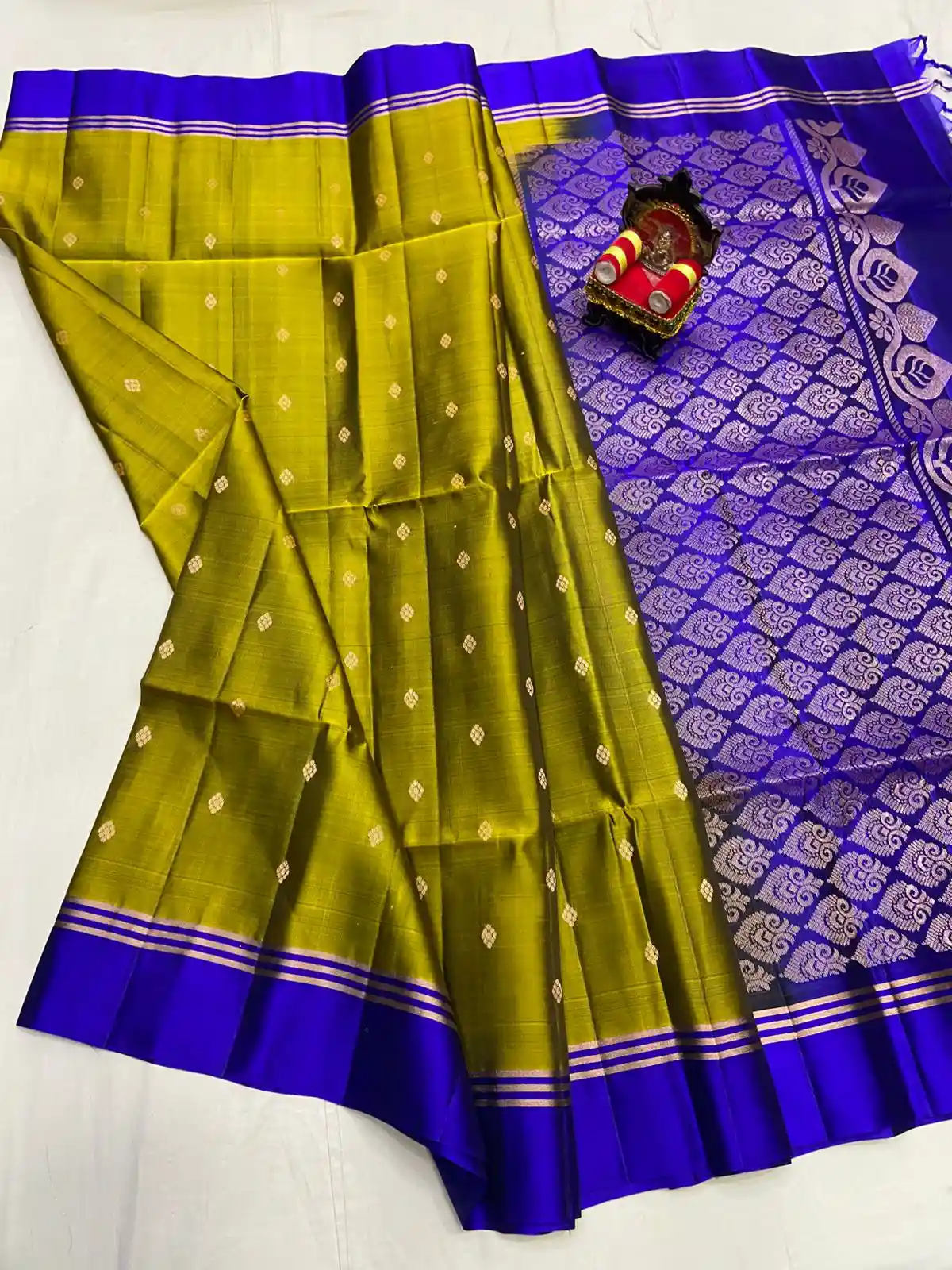 An elegant olive green silk body highlighted with delicate zari motifs, contrasted by a striking royal blue pallu woven in traditional patterns. A bold yet graceful Kanchipuram classic.