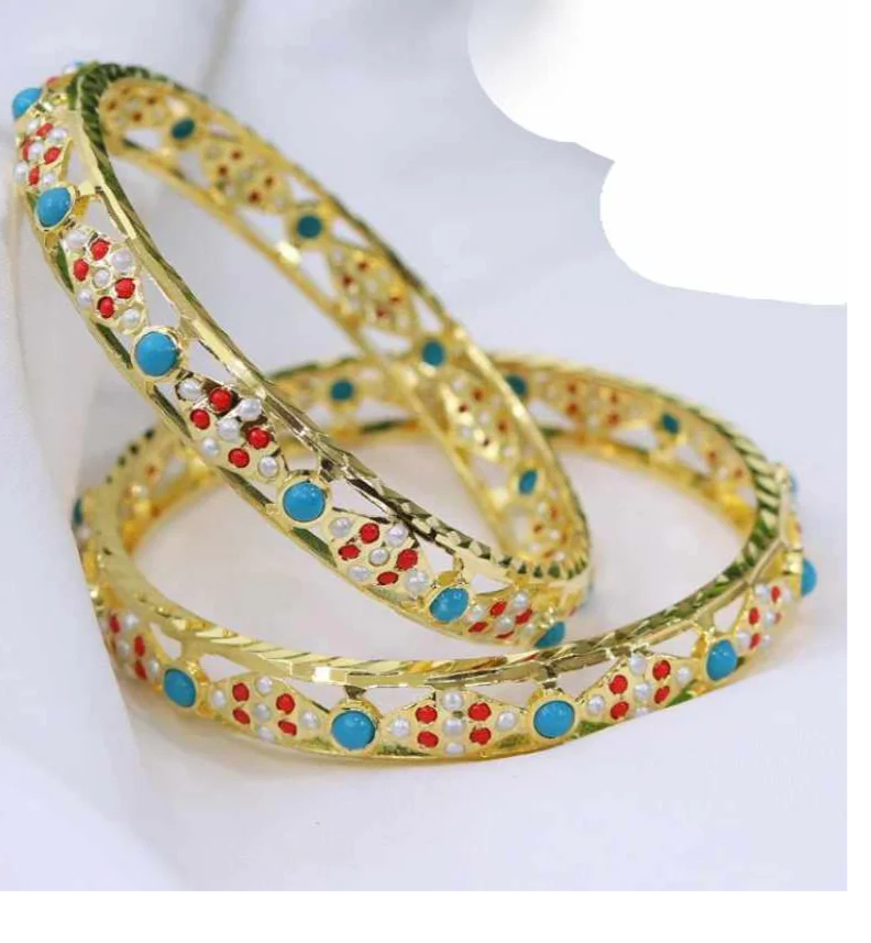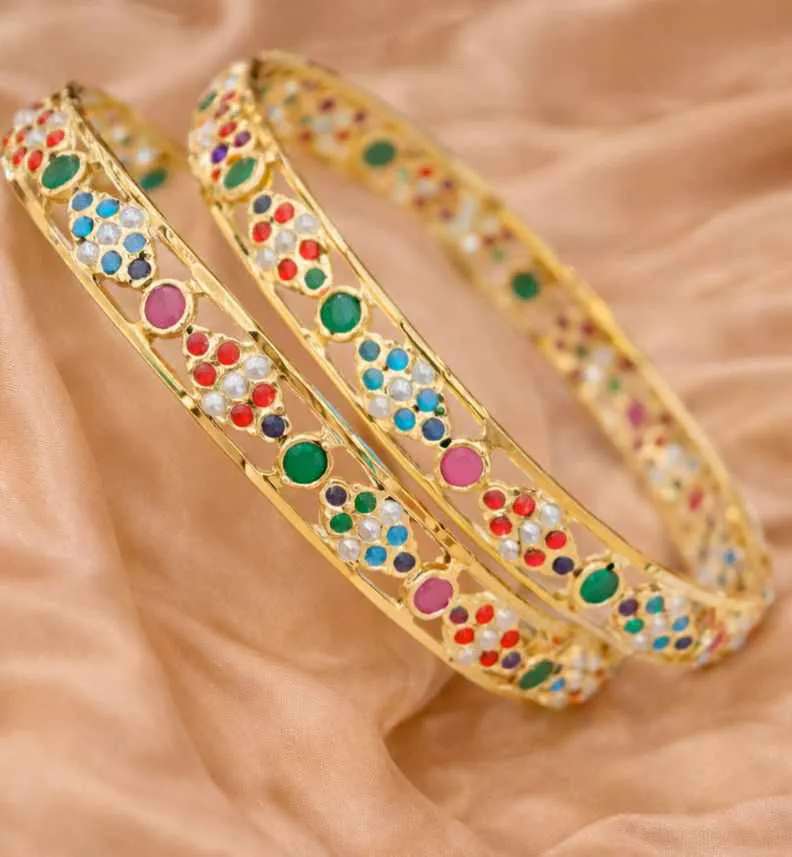Each piece showcases a harmonious floral lattice design, enriched with vibrant stone embellishments that add a graceful pop of color while maintaining a regal gold-toned base. The detailed craftsmanship reflects heritage aesthetics, making these bangles perfect for weddings, festive occasions, and cultural celebrations.