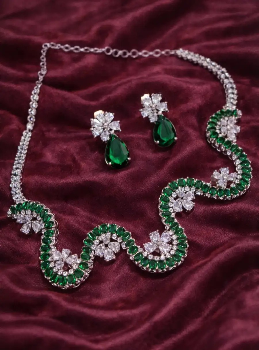 The Panna Valli Diamond Cascade Necklace Set is a celebration of fluid elegance and botanical grace. Designed in a captivating wave silhouette, this masterpiece features a continuous trail of vivid emerald-toned stones bordered by radiant diamond clusters arranged in delicate floral formations.