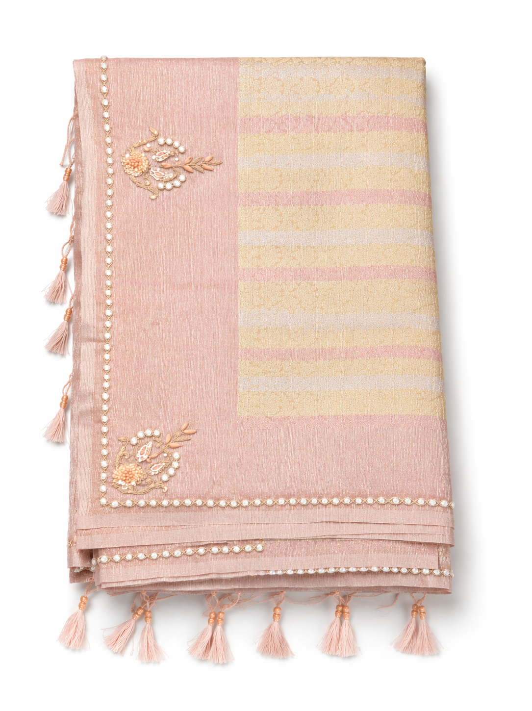 Bring graceful sophistication to your occasionwear collection with this pastel peach designer organza saree, beautifully accented with a delicate pearl border, soft woven textured panel, and charming floral embellishment detailing. With its airy drape, subtle sheen, and refined handcrafted finish, this saree is perfect for engagements, receptions, festive celebrations, cocktail evenings, bridesmaid looks, and elegant party wear styling.