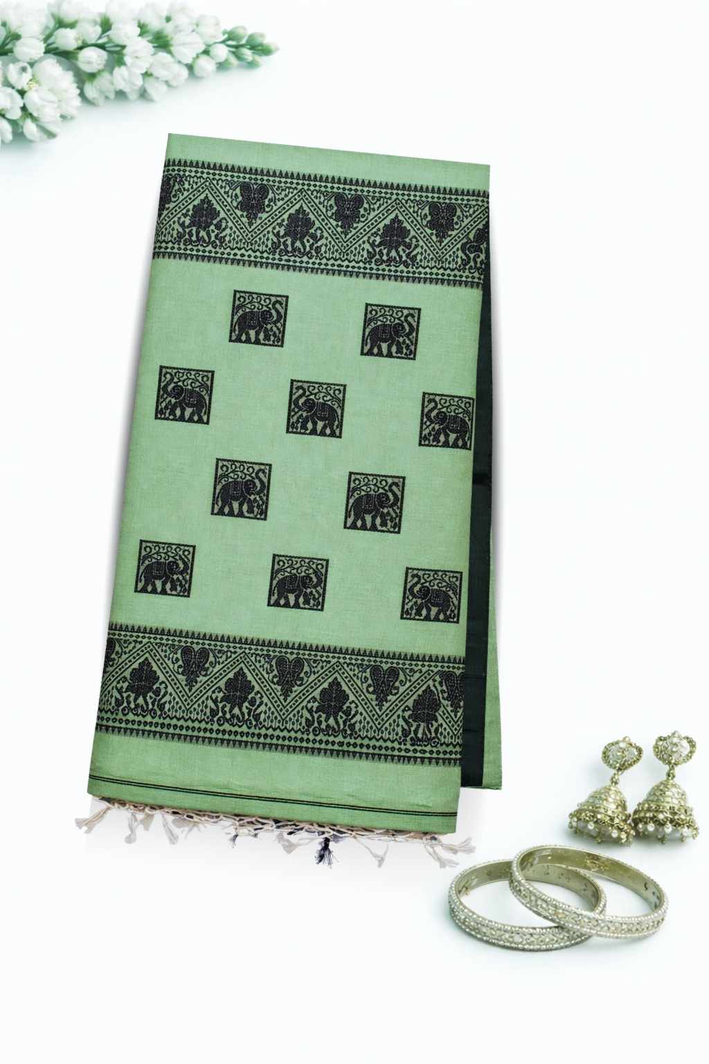 Pista Green Cotton Jamdani Saree with Black Elephant Motifs