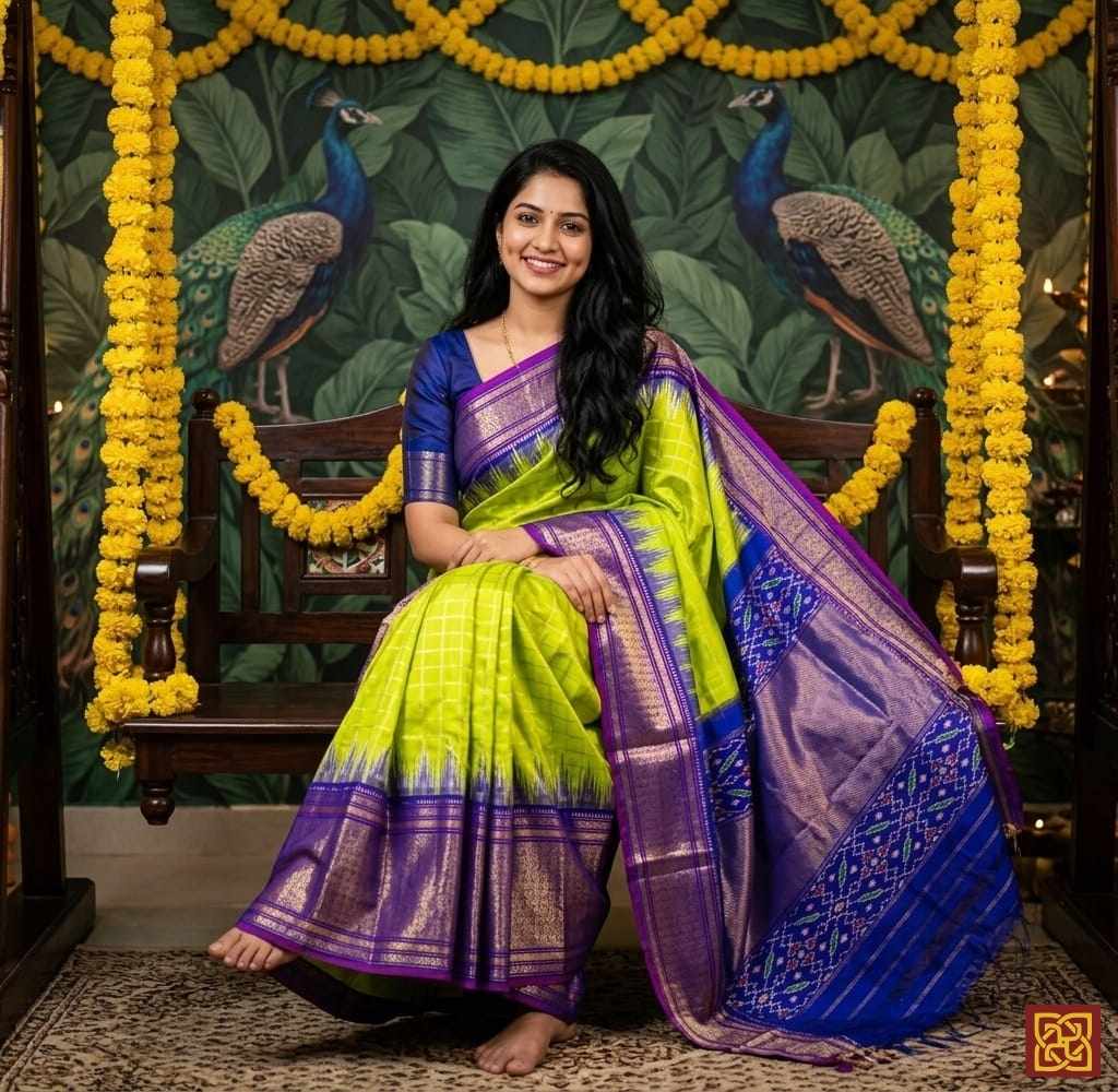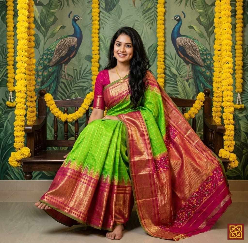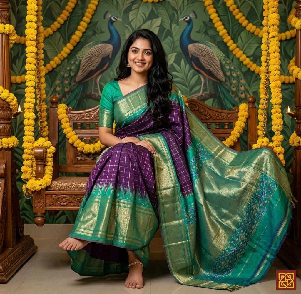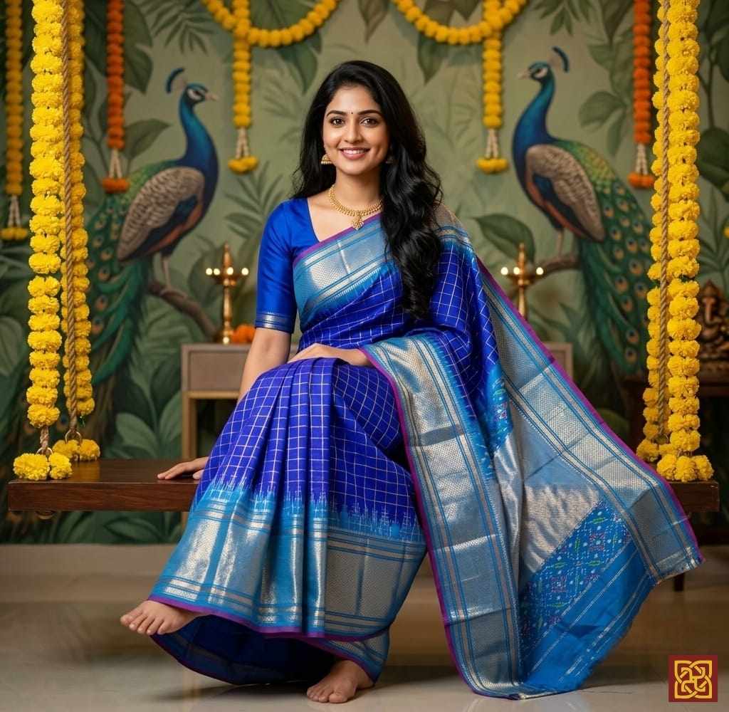 - Motifs: Ikat-inspired checks, woven geometric layout, traditional handloom accents