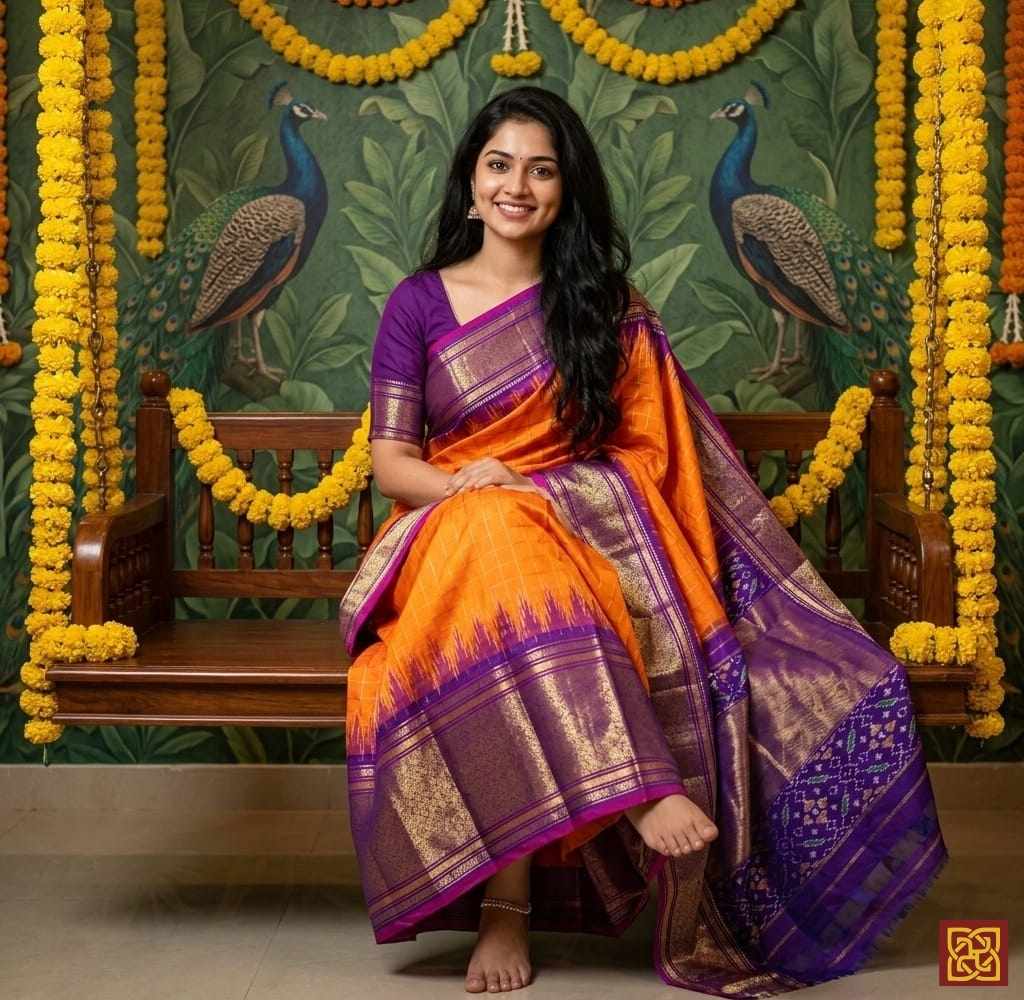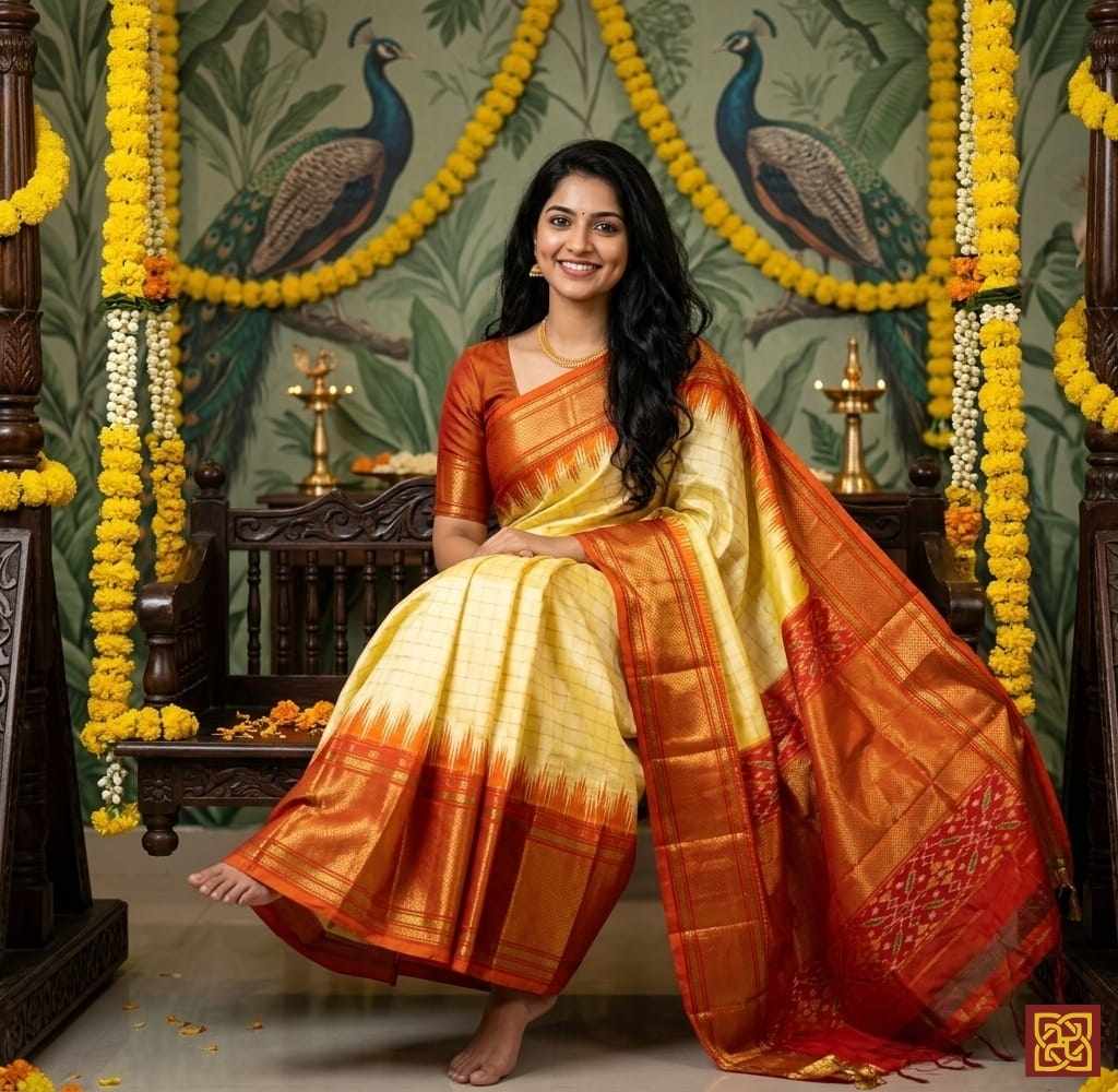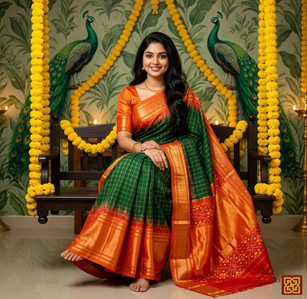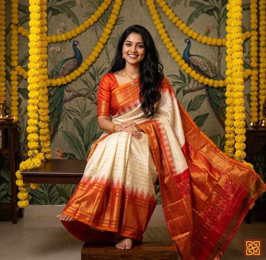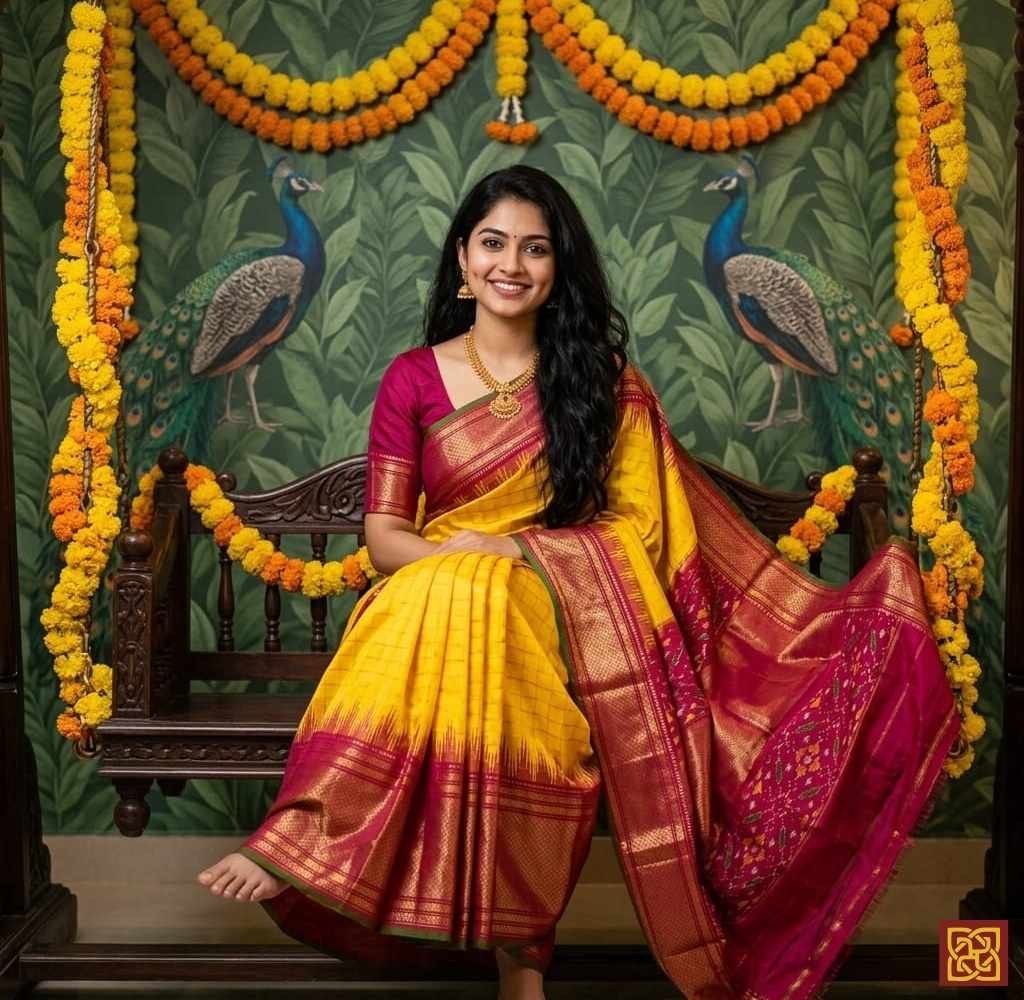 - Motifs: Ikat-inspired checks, woven geometric layout, traditional handloom accents