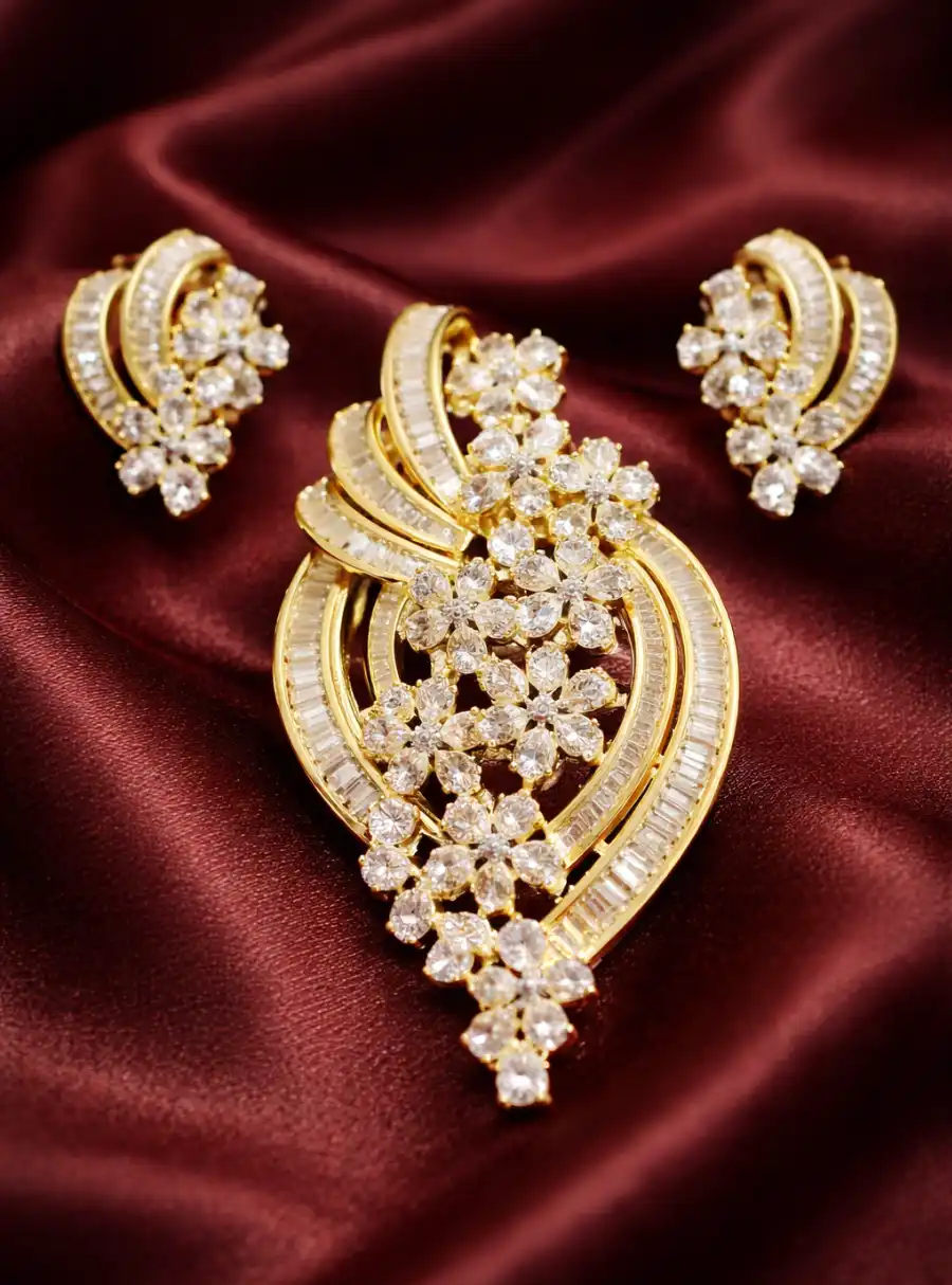 The Pushpavalli Layered Floral Pendant Set is a celebration of layered elegance and radiant craftsmanship. Designed in a flowing leaf-inspired silhouette, this statement pendant features cascading floral clusters set within graceful gold curves.