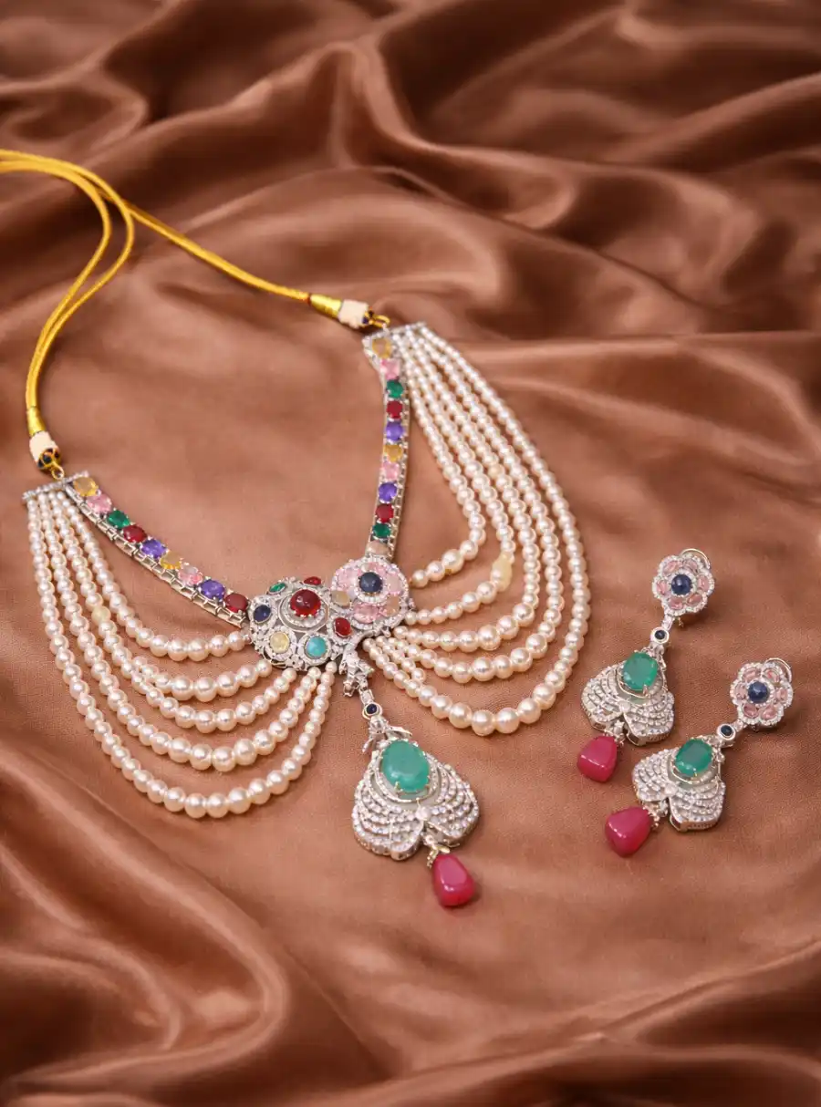 The Rajsi Navratna Pearl Haar Set features elegantly cascading strands of luminous pearls, gracefully draped to create a majestic silhouette. At its center rests an intricately detailed navratna-inspired motif, adorned with vibrant multicolored stones that symbolize prosperity, harmony, and heritage.