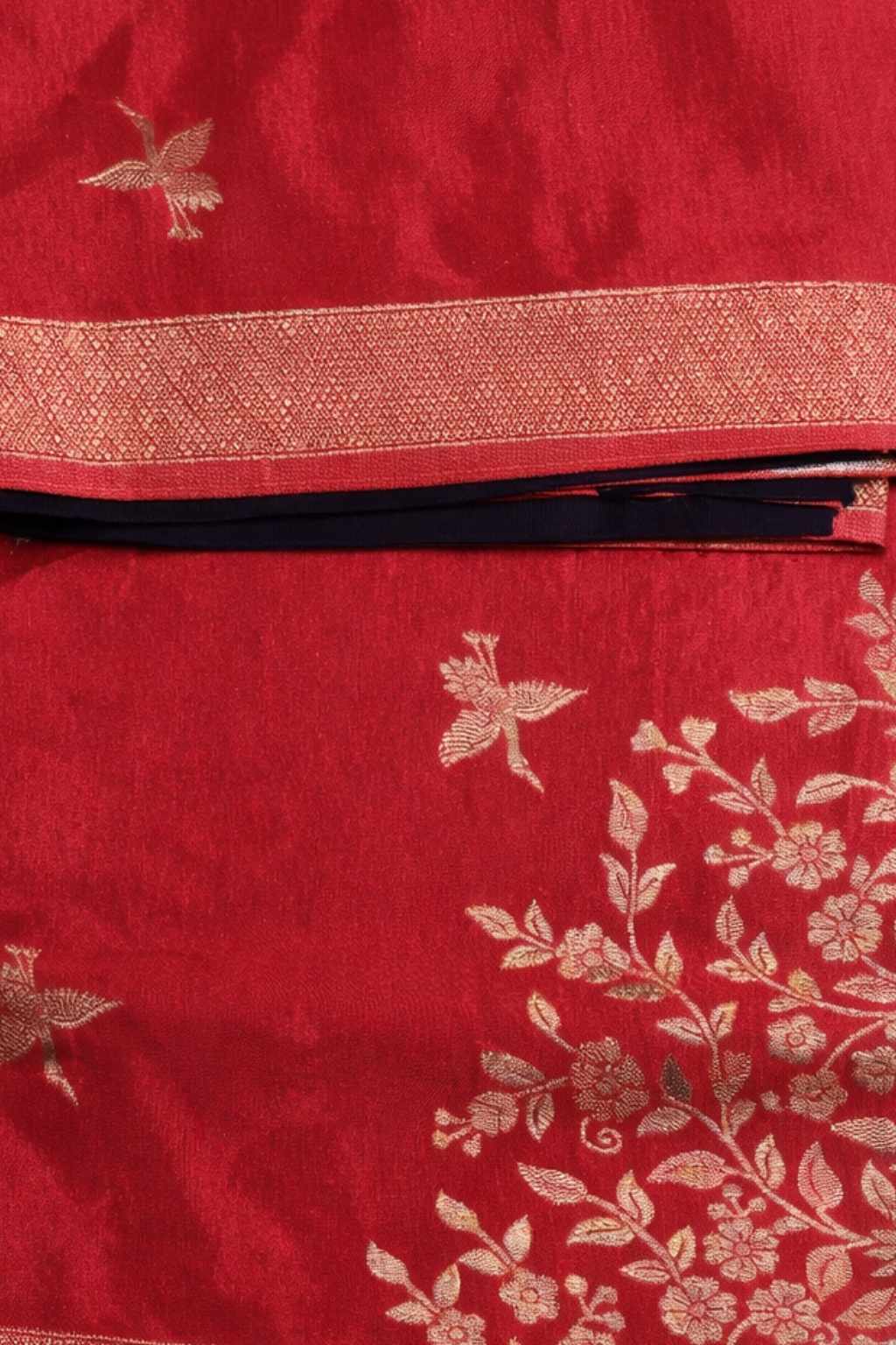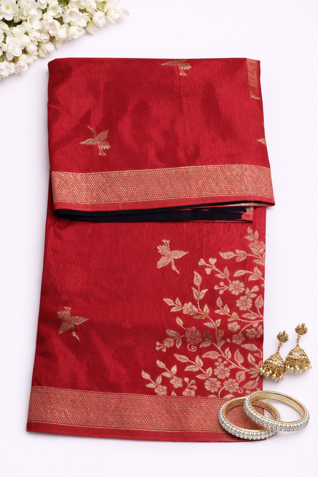 Red Russian Silk Saree with Floral Weave & Bird Motifs