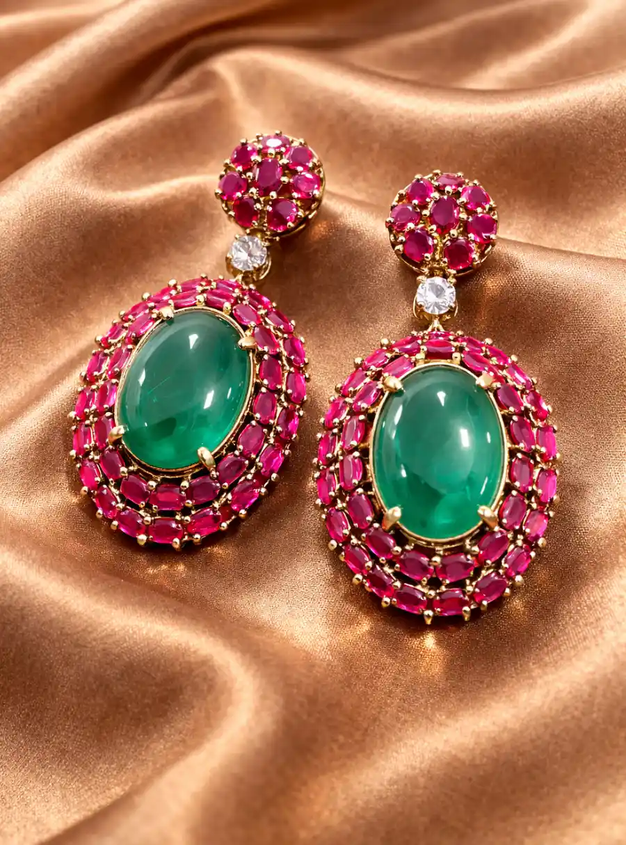 The Ruhani Emerald & Ruby Halo Statement Earrings are a striking fusion of royal color and intricate craftsmanship. At the center rests a luminous emerald-toned oval cabochon, exuding depth and elegance. Surrounding it is a radiant double halo of rich ruby-pink stones, meticulously set in a warm gold finish to create a bold yet harmonious contrast.
