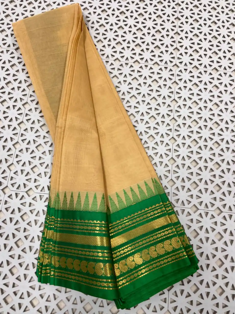 Sandalwood Beige Soft Cotton Kuppadam Saree with Emerald Green Border