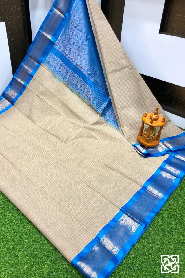 The saree features a refined checks or plain body, offering a subtle textured look that enhances its classic appeal. The highlight lies in its jacquard Kanchi-inspired contrast border, intricately woven to add depth and traditional charm. Completing the look is a rich contrast pallu, designed to elevate the saree with a graceful finish.